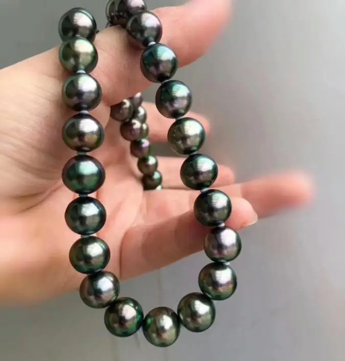 Product Name: Enorme Aaa 10-11mm Redondo Mar Do Sul Genuíno Preto Verde Pérola Colar 18 "925 Prata Ouro