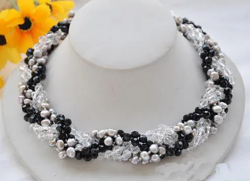 Special Offer Trabalho Manual Por Atacado Jóia Da Pérola, 6 Linhas 18 Polegadas Cinza Pérolas Barrocas Limpo Preto Cristal Facetado Colar De Malha Discount [NEW!!] Today!