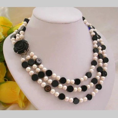 Special Offer Linda Pérola Jóias, 3 Linhas 8mm Rodada Ágatas Pretas Branco De Água Doce Colar De Pérolas, Frete Grátis Discount (25%OFF) Today!